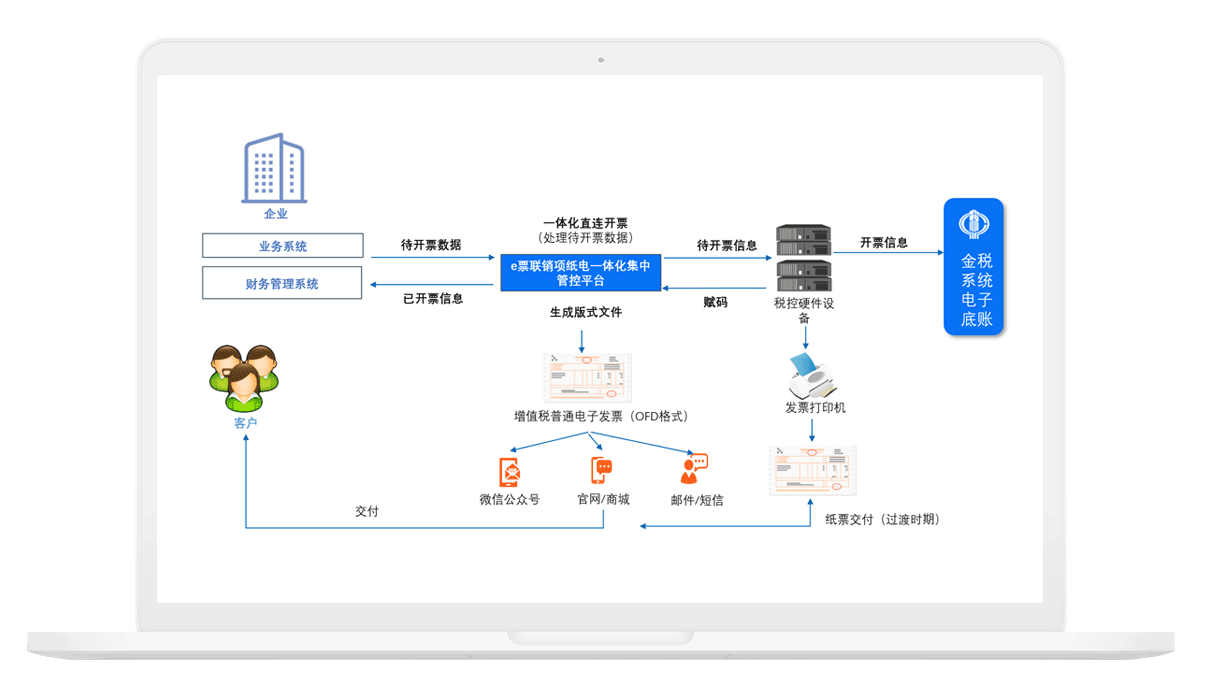 吉智数联是一个开放平台,通过标准API接口支持企业各种业务系统的集成,不仅无缝对接业务系统实现数据同步,而且为企业提供全设备、全票种、多场景开票的个性化需求。
