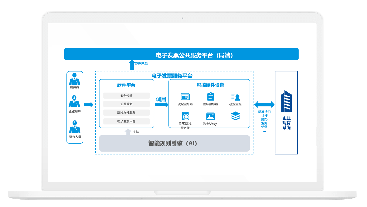 企业自建电子发票平台针对企业自建电子发票服务平台,吉智数联完全符合国家税务总局的相关规范要求,提供税控服务器、签名服务器等必要的平台建设基础设施,以及安全可信、性能稳定、可拓展式的电子发票系统。